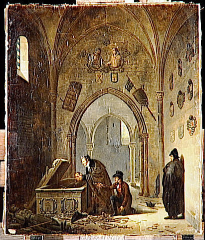 | Vivant Denon en Espagne, remettant dans leurs tombeaux les restes du Cid et de Chimène. Alphonse Roehn, 1809. Mussée du Louvre, París (ref. 1988-52). |